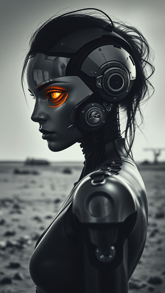 Capture a captivating image of the Enigmatic Cyborg Woman, her metallic features partially obscured by darkness as she stands resolute against an austere, barren backdrop, her illuminated amber eye cutting through the shadows. Shot with a Canon L Series 70-200mm f/2.8 lens, ISO 1600, in a monochrome futuristic aesthetic, aspect ratio 9:16, envision a world where technology and humanity converge.
