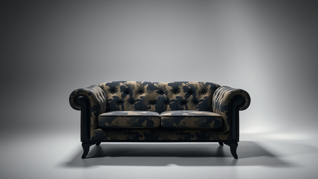 Capture a cinematic front view of a small couch featuring a unique camouflage texture with sleek black steel details. Utilize the Sony α7R IV camera coupled with the Sony FE 24-70mm f/2.8 GM lens, set to f/8 for optimum detail sharpness. Use a shutter speed of 1/125 to freeze the moment while maintaining ISO at 100 to ensure superior image quality. Illuminate the scene with a blend of realistic sunlight and softbox lighting, emphasizing the details from light patterns to material textures. The setting is a stark low hue photo studio with a solid background, featuring high-contrast black and white highlights. Ensure the focus remains sharp and clear, capturing every detail in stunning UHD resolution. The overall composition exudes a glamorous and professional aura with a raw, stylized touch.