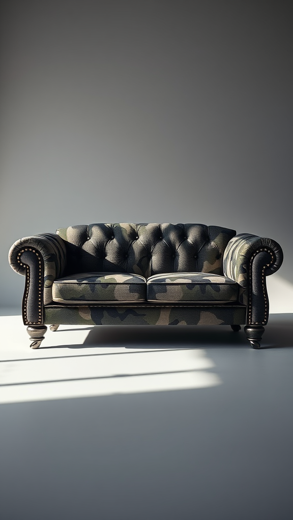 Capture a cinematic front view of a small, creatively designed couch adorned with a camouflage texture and steel details, utilizing the Sony α7R IV camera with the Sony FE 24-70mm f/2.8 GM lens. Set the aperture to f/8 for optimal sharpness, maintain a shutter speed of 1/125 to freeze motion, and use an ISO of 100 for the finest image quality. Present every detail from the light patterns to the material textures in a professionally composed image. Employ a low-hue solid background in a photo studio, utilizing high-contrast white and black elements with highlights to enhance the scene. Incorporate realistic sunlight combined with softbox lighting for balanced illumination. Ensure a sharp focus, clear and detailed representation, and glamourous UHD quality. The background should remain solid while offering a touch of creative flair, producing a vivid and sharp visual appeal.