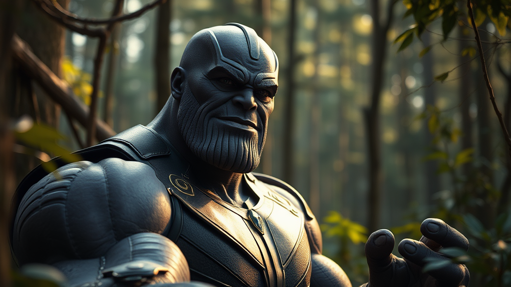 Capture a cinematic scene of a friendly Thanos situated in a lush forest of Himachal Pradesh, showcasing clear facial features and a robust, toned physique. Use a 20mm lens at f/1.8 to emphasize depth, with accent lighting creating a mystical ambiance, and global illumination highlighting the vibrant surroundings. The composition should focus on Thanos' presence, blending his iconic stature seamlessly into the majestic natural setting.