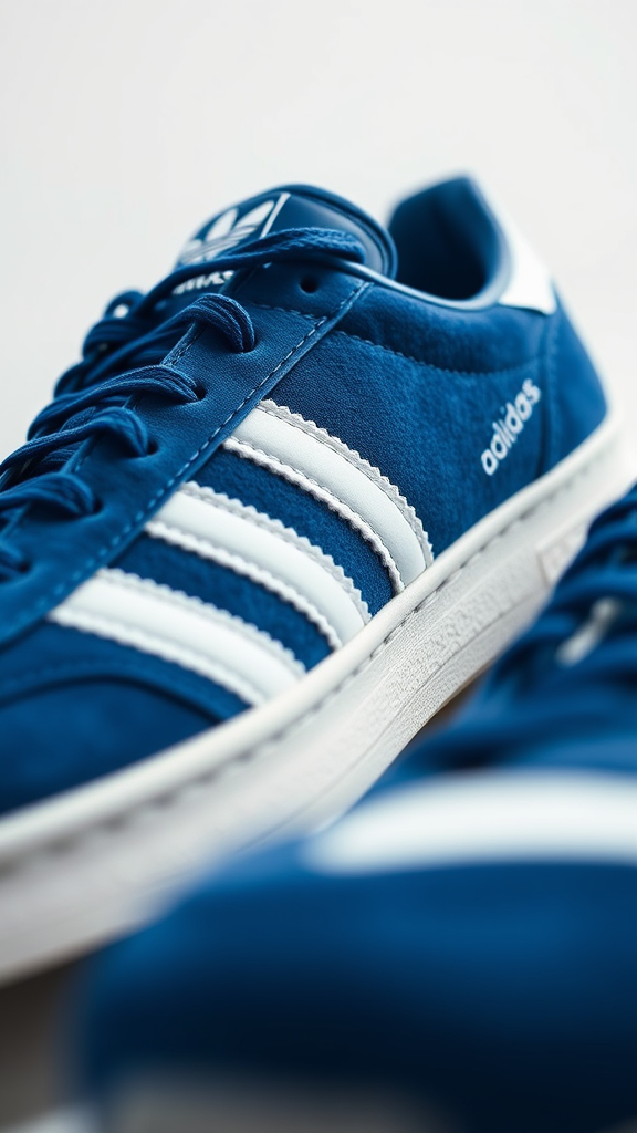 capture a close-up photograph of Adidas blue suede sneakers with white stripes using a Sony A7R IV camera equipped with an FE 50mm f/1.2 GM lens, set against a solid white background, emphasizing realism through lighting and contrast, showcasing hyper resolution and ultra-high definition with intricate details, incorporating an aspect ratio of 9:16 and maintaining a raw, stylized aesthetic with a hint of creative flair.