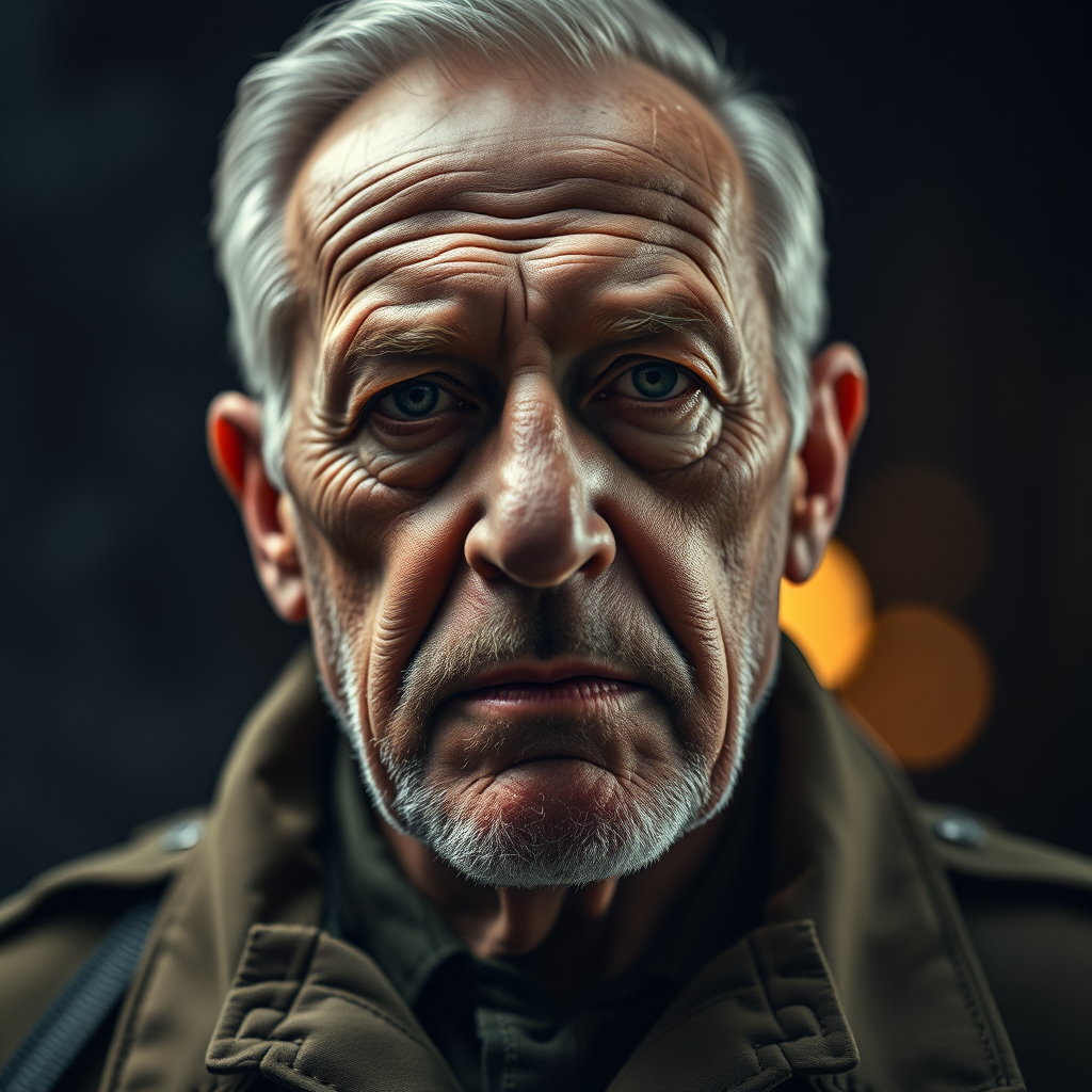 Capture a close-up portrait of a 62-year-old seasoned and decorated general, exuding toughness and stoicism. He is clean-shaven with a serious demeanor, photographed in a cinematic, moody style that highlights his gravitas. The image is highly detailed, shot in 4k for an epic, richly textured quality with a dark, atmospheric bokeh background, reminiscent of a high-stakes HBO drama.