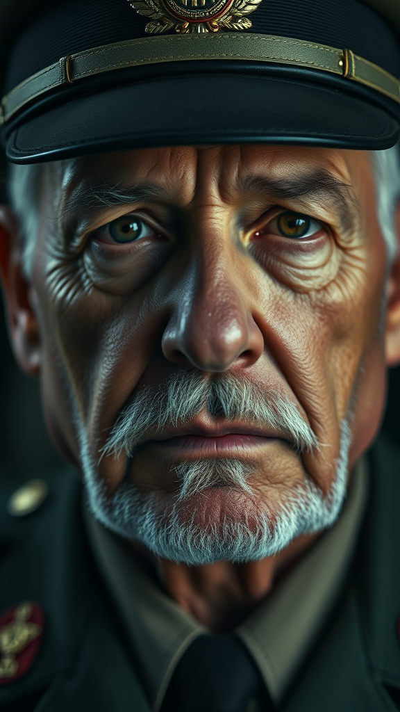 Capture a close-up portrait of a seasoned 62-year-old resilient decorated general, clean-shaven, exuding a serious, stoic demeanor. The image should be cinematic and strikingly detailed, shot in 4k resolution on Kodak film, showcasing a rich bokeh effect in a dark, moody style reminiscent of a high-quality HBO production. Adjust the lighting to create a dramatic and intense atmosphere, highlighting the general's deep-set eyes and weathered features that tell a story of years of service and leadership.