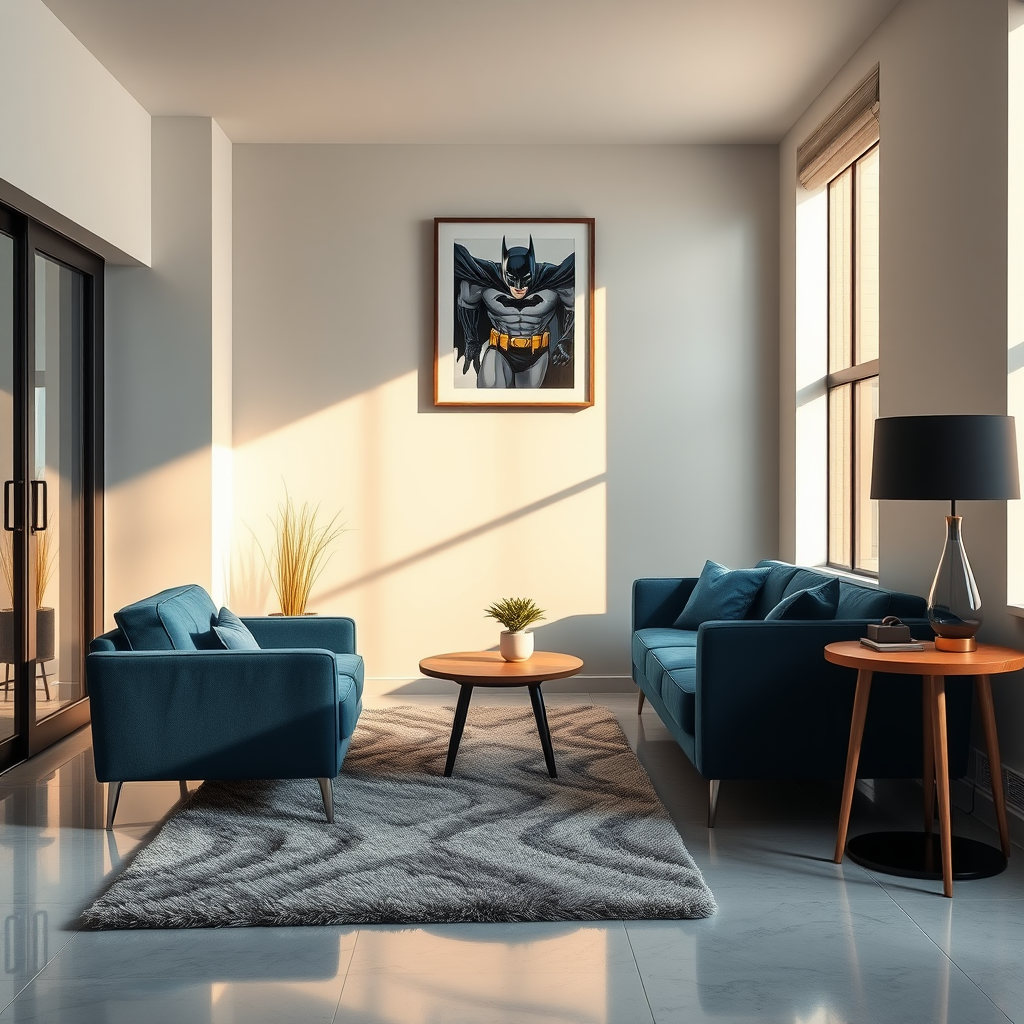 Capture a contemporary lounge in the morning with a polished tile floor and a plush rug, featuring a captivating Batman illustration in a sleek frame. The scene includes a deep blue sofa set complemented by a stylish wooden side table, all bathed in natural light. The ambiance is crisp and ultra-high-definition, with subtle creative accents adding character to the sophisticated space.