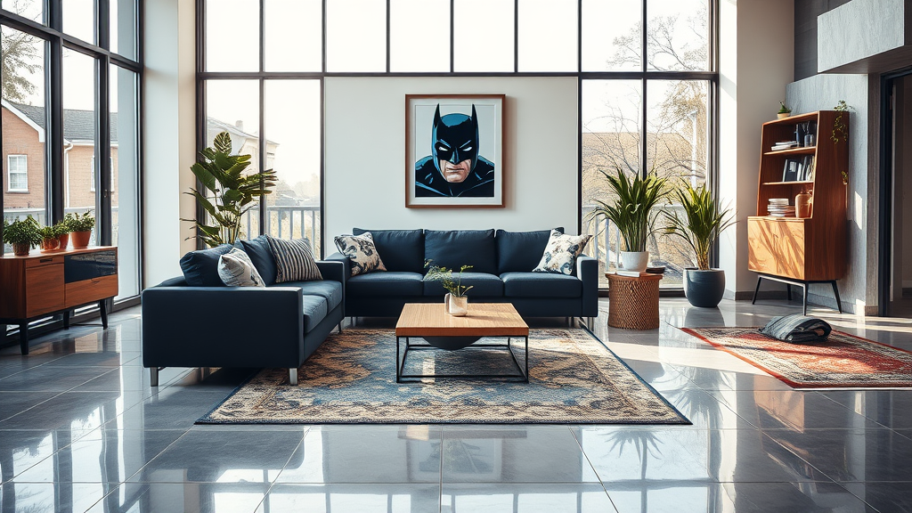 Capture a contemporary lounge on a serene morning with polished tile flooring and unique rug patterns, showcasing a striking Batman illustration art frame. The space features a dark blue sofa set paired with a sleek wooden side table, bathed in natural light streaming through large windows. The atmosphere is refined and ultra-high-definition details bring every element to life with a touch of controlled chaos and a raw, authentic style.