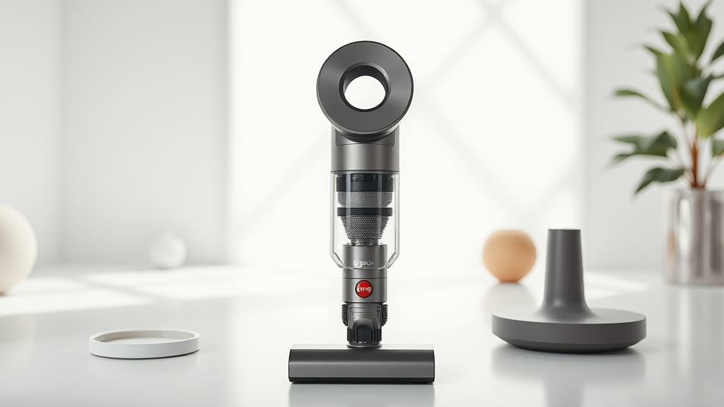 Capture a detailed close-up of a sleek Dyson product in a pristine studio setting, utilizing a 100mm lens to enhance its design features, bathed in bright, crisp midday lighting that highlights its modern elegance, surrounded by minimalistic objects that accentuate its innovative form.