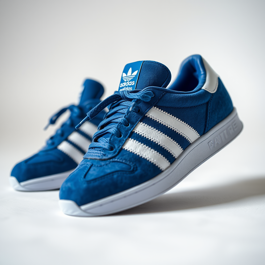 Capture a detailed close-up photograph of Adidas blue suede sneakers with white accents using a Sony A7R IV and a FE 50mm f/1.2 GM lens. The image should have a solid white background with an out-of-focus effect and a realistic lighting setting that enhances contrast and hyper resolution. The composition should emphasize the textures and details of the sneakers, presented in a 9:16 aspect ratio with a raw, stylized appearance and a touch of creative flair.