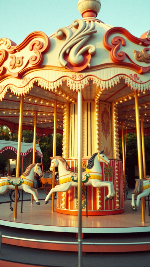 Capture a dreamy, minimalist scene of a carousel with a nostalgic vibe, reminiscent of Kodak film photography. The image should evoke a modern Instagram aesthetic, featuring soft, soothing colors and high-resolution clarity, maintaining a sense of whimsy and charm, aspect ratio 4:3.