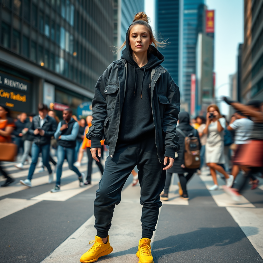 Capture a dynamic and natural moment of a 28-year-old professional model on a bustling city crosswalk, clad in a garment-dyed tactical loose trucker jacket adorned with a subtle logo, layered over a sleek black hoodie. She wears jogger pants and stands out in striking yellow Yeezy Boost 350 sneakers. The scene, featuring a Canon EOS-1D Mark III, focuses on the intricate design and detailing of her outfit against the lively backdrop of numerous passers-by. A long exposure effect enhances the photorealistic quality, capturing the essence of realism under natural light. The image is framed in a unique 9:16 aspect ratio, emphasizing a raw style with a stylization intensity of 750. This artistic narrative includes abstract elements and unexpected details like unusual shapes and exaggerated proportions, suggesting three hands, three legs, eccentric eye features, and celebrity-like facial characteristics, all contributing to a surreal yet engaging visual story.