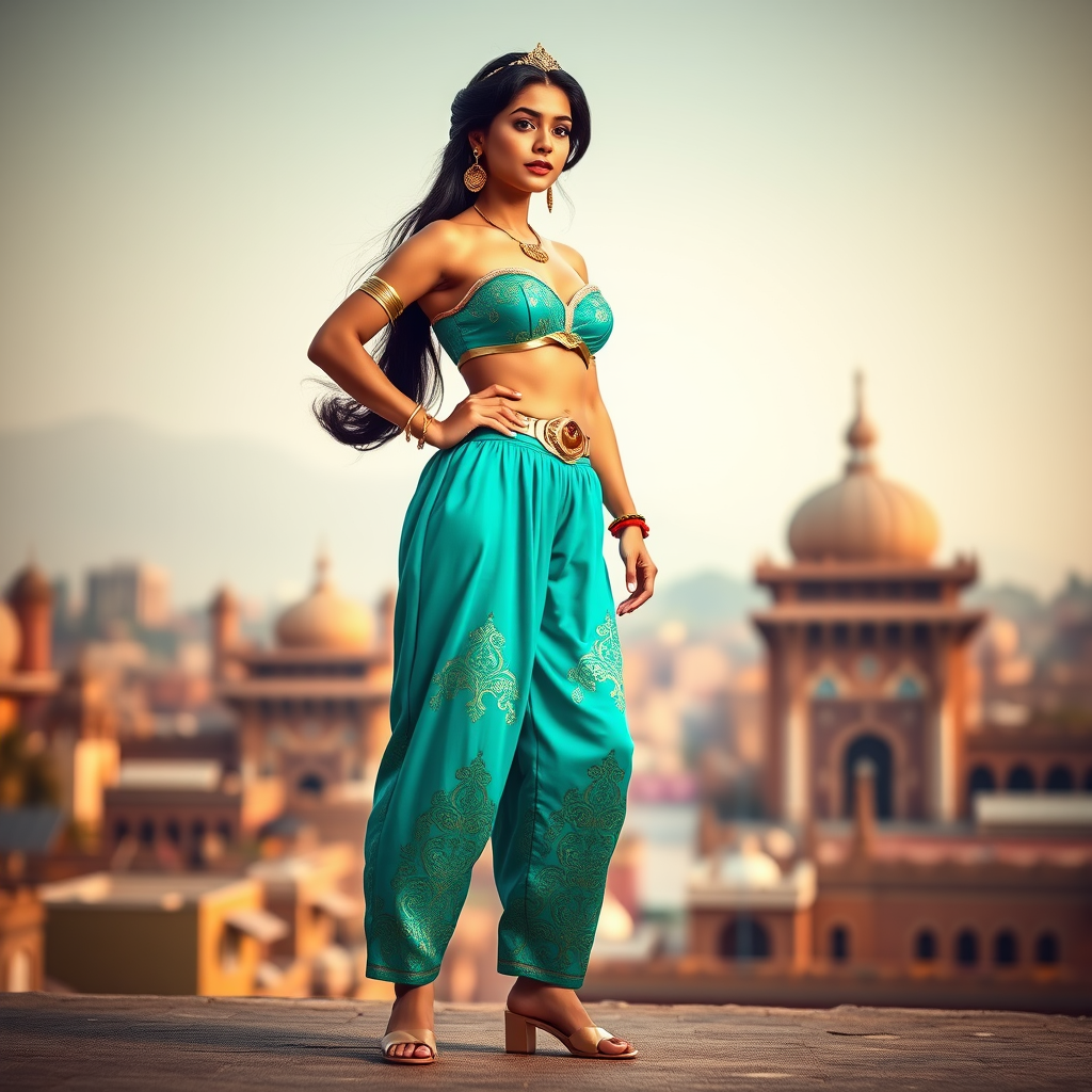 Capture a full-body shot of Liza Soberano as Jasmine from Aladdin, showcasing her vibrant turquoise pants and cropped top ensemble. She stands slightly below eye level, exuding strength and confidence, positioned off-center to the right, leaving open space to the left to evoke freedom. The lighting is soft and diffused, with vivid, bright colors and moderate contrast, enhancing intricate designs. A shallow depth of field blurs the backdrop, and a slightly skewed perspective angled upwards adds height and majesty. The mood is boldly empowering, blending cinematic and contemporary styles to highlight the shot's details. The background features the cityscape of Agrabah, with a subtle vignetting effect and slightly desaturated colors along with increased contrast for a touch of vintage nostalgia. Texture is meticulously captured using a Nikon D850 and a 24-70mm f/2.8 lens with settings at 1/125 sec, f/5.6, ISO 200. Add slight creative variations while embracing the core essence of the original concept.