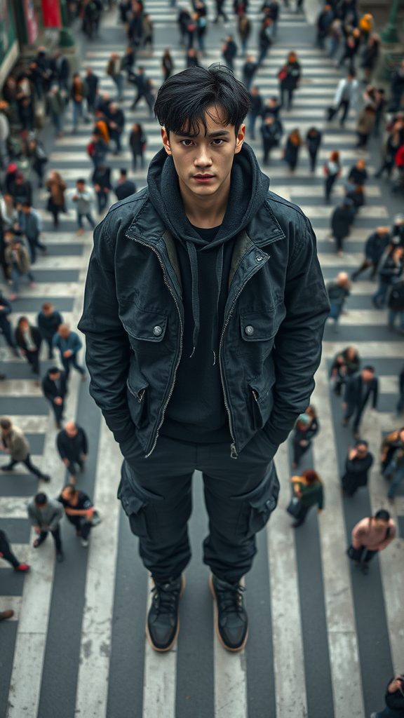 Capture a high aerial view of a Korean model standing confidently amidst a vast, intricate crosswalk reminiscent of Shibuya's bustling scramble. The model gazes intently into the camera, exuding an enigmatic presence. They are dressed in cutting-edge techwear: a sleek, black-washed safari jacket layered over a thick black hoodie, paired with black-washed cargo jogger pants. Dark gray tactical boots complete the look, blending seamlessly with the urban landscape. Around them, a sea of people moves in dynamic patterns, underscoring the model's poised stillness. The atmosphere is raw and immersive, with the model emerging as a focal point in this lively, metropolitan scene.