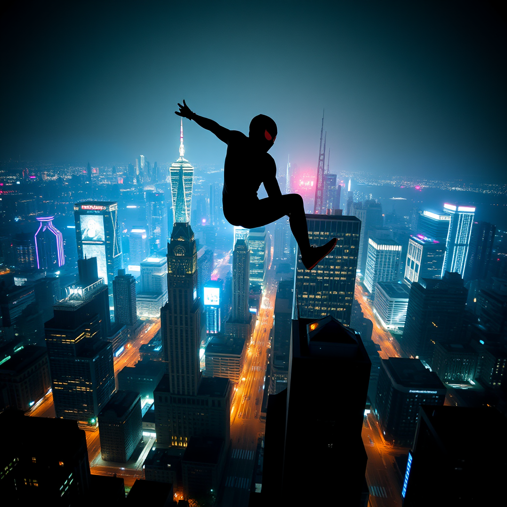 Capture a high detailed, super realistic silhouette of Spiderman in his sleek black suit, effortlessly clinging to a towering building with one powerful hand. The sprawling metropolis at night serves as the dramatic backdrop, with bright lights and towering skyscrapers casting a luminous glow over the urban landscape, while dark shadows and alleys loom below. Using a Canon EOS R5 with a Canon RF 24-70mm f/2.8L lens, set the ISO to 200, aperture to f/2.8, and shutter speed to 15 seconds, with white balance on auto. Utilize a Manfrotto MT055CXPRO4 tripod and a Canon BR-E1 remote shutter release to experiment with low-angle shots and framing to emphasize Spiderman's silhouette against the vibrant city lights. Make subtle creative adjustments while maintaining the essence of the concept.