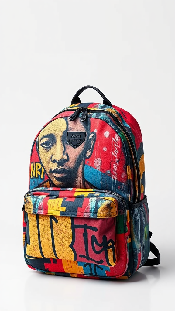 Capture a high-resolution, 4K photograph of an urban backpack inspired by the iconic art style of Jean-Michel Basquiat, set against a pristine white background. The design showcases vibrant colors and intricate textures, reminiscent of Basquiat's abstract street art, with detailed graffiti patterns and expressive brushstrokes. The composition should highlight the backpack’s texture and craftsmanship, conveying an urban, artistic vibe.