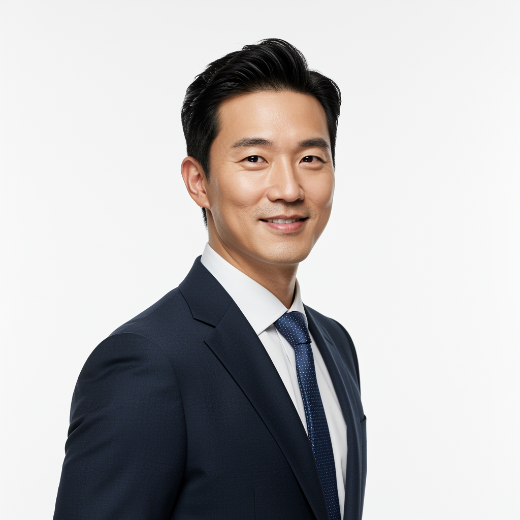 Capture a high-resolution image featuring a confident and handsome Asian business professional with a slim physique against a pristine white background. The photograph should exhibit the quality of an 8k ultra-high-definition shot, taken with a DSLR camera, utilizing soft, flattering lighting to highlight the subject's features. The image should have a refined film grain texture, reminiscent of a Fujifilm XT3 capture, offering a sophisticated and polished appearance.