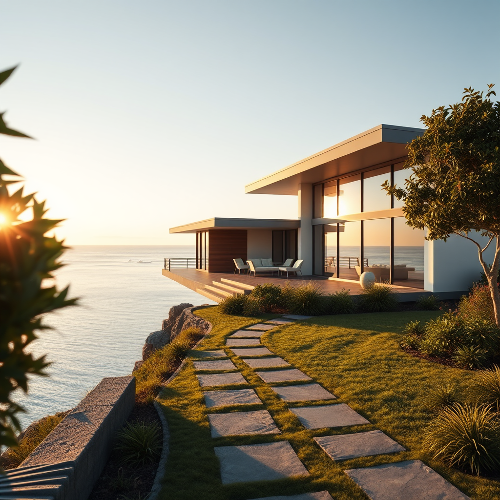 Capture a hyper-realistic exterior photo at eye level of a mid-century modern style house perched above a tranquil ocean, bathed in the soft glow of daylight with gentle, indirect lighting. The house exudes an AD magazine aesthetic, drawing inspiration from the visionary designs of Frank Lloyd Wright, the sleek elegance of Eames, and the minimalistic precision of Mies van der Rohe. Subtle creative touches include a stone pathway leading to the entrance and large, panoramic windows reflecting the serene seascape, while lush, native plants gently frame the structure, enhancing its harmonious integration with the natural environment.
