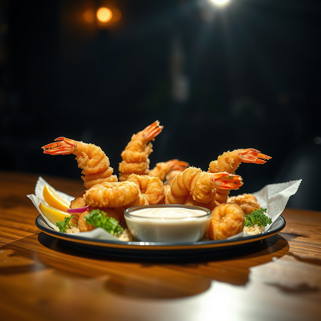 Capture a lavish close-up shot of a gourmet fried shrimp platter, perfectly arranged with a serving of eloquent tartar sauce. The scene embodies the essence of high-end food photography, highlighted by a clean and elegant composition. Dramatic lighting casts a luxurious and indulgent aura over the dish, enhancing its mouth-watering appeal. Taken with a Nikon Z7 using a 105mm lens, the image centers the platter, bathed in soft directional light from one side, emphasizing the textures and colors. A food stylist carefully curated the scene, set in the refined ambiance of an interior space during evening hours.