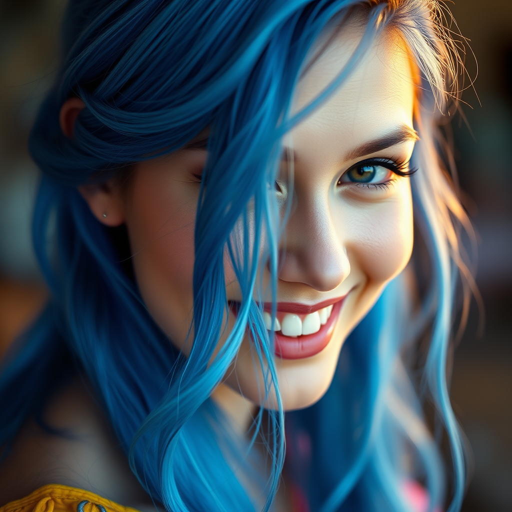 Capture a mesmerizing portrait of a captivating woman with blue hair, showcasing a radiant smile, inspired by animated GIF styles, highlighting candid moments and fleeting details. Imagine the photo shot with Provia film, evoking the artistic touches of Inessa Garmash and Natalia Rak. The scene is vibrant and colorized, featuring an aspect ratio of 51:109, crafted with a raw, unfiltered aesthetic, version 5.1.