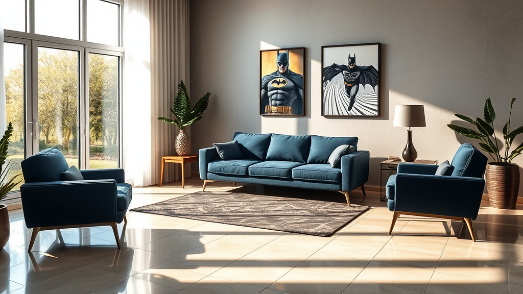 Capture a modern lounge bathed in morning light, where a sleek dark blue sofa set stands on a polished tile floor, accented by a distinctive rug. A wooden side table complements the space, while a striking Batman illustration art frame adds a contemporary flair. Natural light floods the room, enhancing the raw, ultra-high-definition ambiance and creating a serene yet dynamic atmosphere.