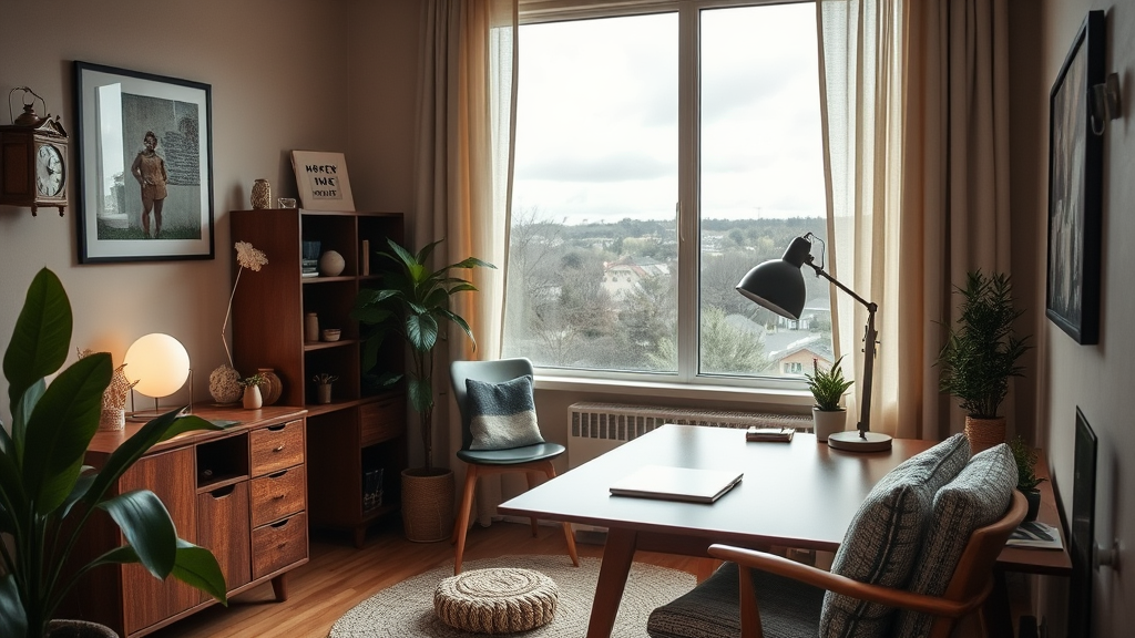 Capture a photograph of a mid-century inspired home office on a cloudy day, exuding a warm and inviting atmosphere. Subtly incorporate charming objects like a vintage clock and a minimalist desk lamp, all set within a cozy nook that blends natural textures with modern design elements.