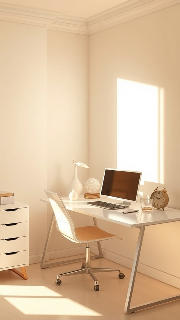 Capture a photograph of a minimalistic home office that beautifully balances soft sunlight and warm artificial lighting to create an inviting warm white atmosphere. The scene includes discreetly placed objects like a sleek vase and a simple clock, all contributing to a harmonious workspace. The composition highlights the interplay of natural and artificial light, casting gentle shadows and enhancing the serene ambiance within a vertically oriented frame.