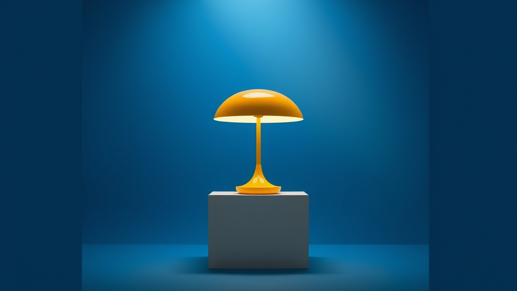 Capture a photorealistic image from the front view, focusing on a Louis Poulsen Panthella 250 table lamp in sleek, reflective yellow. Use a Nikon D850 with a Nikon AF-S Micro-Nikkor 60mm f/2.8G ED lens, set to an aperture of f/8 and ISO 100. Position the lamp atop a 45-degree white square box in a professional photo studio setting. Employ studio lighting to highlight contrast against a deep blue solid background, with a square soft box casting sunlight-like illumination. Aim for optimal shape and high detail, resulting in an 8K UHD, raw-style photograph free of strange shapes or unnecessary text.