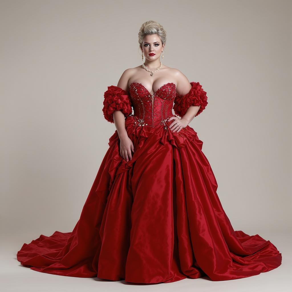 Capture a portrait of a voluptuous woman wearing a luxurious, award-winning red gown designed by the House of Chanel under Karl Lagerfeld. The gown exudes elegance with intricate details. Shot by Annie Leibovitz, the photo features a hip-level angle using a Cinestill Hasselblad 35mm. The lighting creates an exquisite cinematic effect with loop lighting, enhancing the photorealistic and hyper-detailed quality. The composition is a masterpiece of ultra-realism in 8k resolution, emphasizing detailed skin and pores with a matte finish and realistic subsurface scattering. The studio setting highlights each fine detail and shadow, resulting in a high-quality, intricately detailed portrait while maintaining a natural appearance.