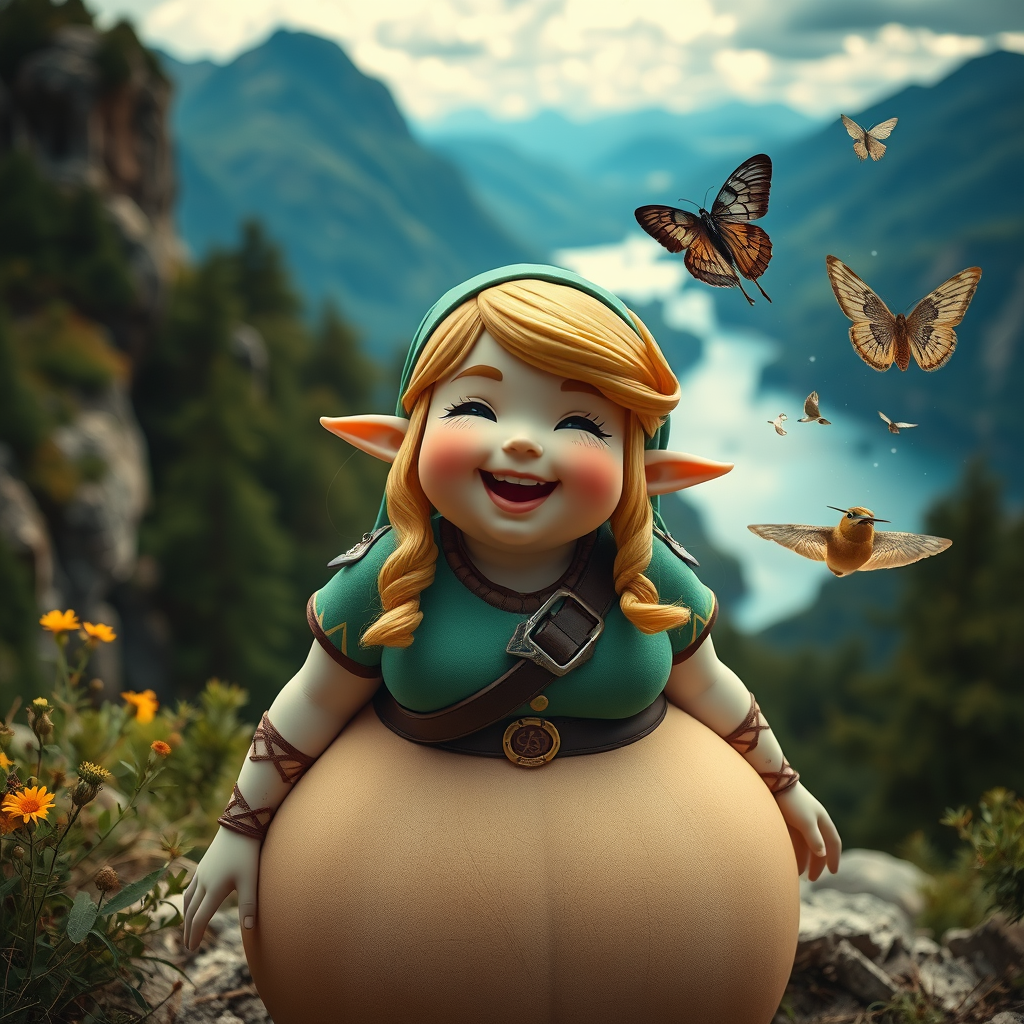 Capture a professional photo of a joyful, plump Zelda amidst stunning natural scenery, with intricate and detailed features, vibrant colors, and sharp clarity. Aim to contrast this beauty with an intentionally abstract and surreal interpretation involving whimsical anatomy, such as extra limbs or floating elements, to create a unique artistic statement.
