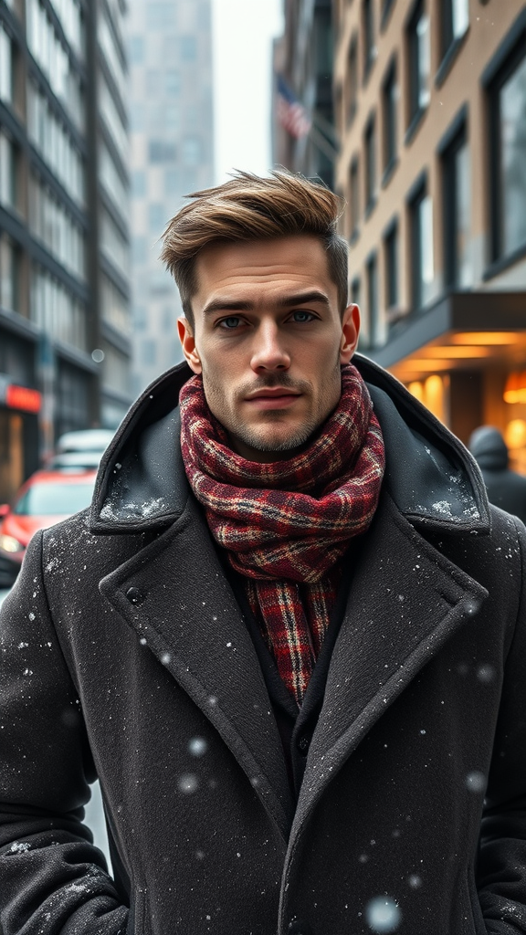 Capture a professional portrait photograph of a strikingly handsome Norwegian man clad in stylish winter attire, positioned outside on a bustling snowy city street. The backdrop is a stunning, modern urban environment that exudes luxury. The image is ultra-realistic, resembling concept art with elegant, highly detailed and intricate features. It boasts sharp focus with a depth of field to emphasize the subject, shot at f/1.8 using an 85mm lens in a medium shot. The scene is captured in soft, bright diffused light with a hint of atmospheric volumetric fog, creating a captivating and ethereal look. The photograph is designed to trend on visual platforms like Instagram and Tumblr, and it is rendered in HDR 4k, 8k quality, showcasing its mesmerizing and contemporary style.