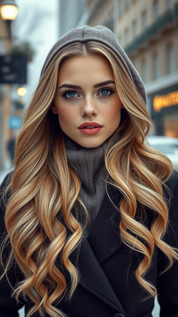Capture a professional portrait photograph of a stunning Norwegian girl in chic winter attire, her long wavy blonde hair cascading gracefully. She wears a flirty expression, her freckled, perfectly symmetrical face complemented by subtle, natural makeup. Set against a snowy city street backdrop, the image showcases a modern, upscale urban environment. The portrait is ultra-realistic and embodies concept art quality with elegant, intricate detailing. It's sharply focused with a depth of field typical of an f/1.8 aperture using an 85mm lens. The medium shot centers the composition, professionally color graded with bright, softly diffused lighting and enhanced by volumetric fog. This captivating image, ideal for social media trends on platforms like Instagram and Tumblr, is rendered in HDR 4K or 8K resolution for stunning clarity and impact.