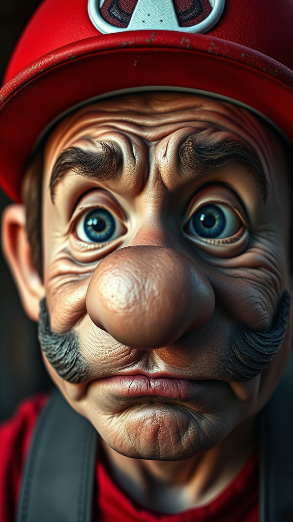 Capture a RAW photo featuring a portrait of an aged Super Mario with intricately detailed textures, showcasing a weary, run-down expression and deep skin pores. He's sporting his iconic red Super Mario hat. The scene is bathed in perfect lighting, achieving photorealism with smooth, hard focus and an impressive depth of field. The image is shot in 8K UHD with a Sony Alpha 1 using an 85mm lens, f/1.4 aperture, at 1/500 shutter speed and ISO 100 film settings. The color palette is neutral and muted. Despite the high detail quality, incorporate subtle imperfections, lending an air of authenticity with slight distortions and unexpected quirks. The overall composition carries elements of realism alongside surreal traces of mutation and decay, providing a compelling visual narrative.