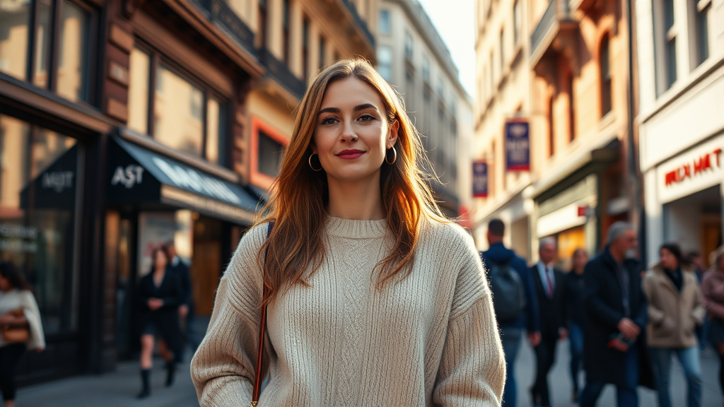 Capture a street style photo of a woman in a chic preppy sweater, bathed in warm natural light, set against the stylish backdrop of Soho. The image is shot on Agfa Vista 200 film, maintaining a vibrant and classic aesthetic in 4k resolution. She stands amidst the lively city vibes, surrounded by the architectural charm of Soho, embodying a blend of modern and timeless fashion elements.