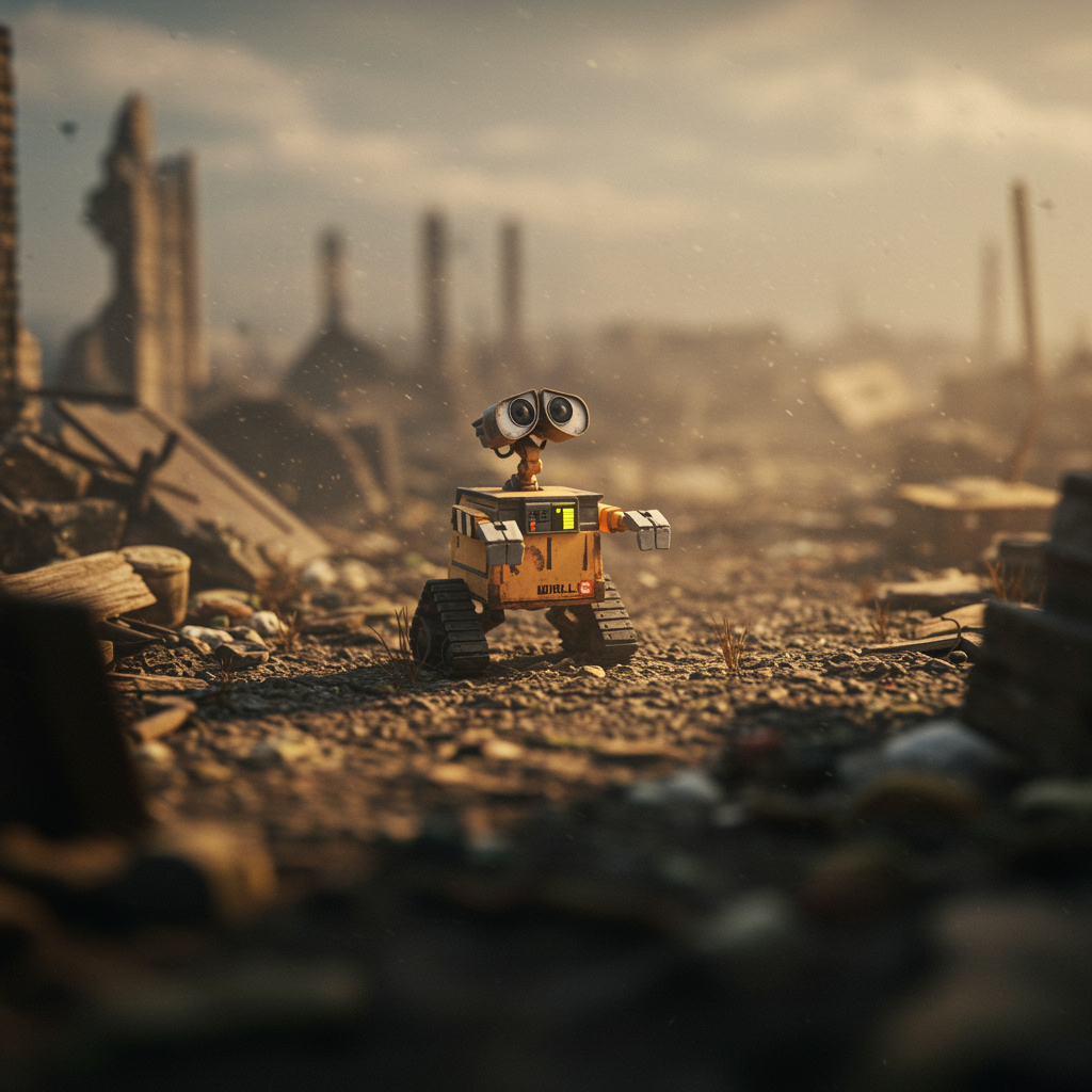 Capture a striking and award-winning image that embodies a 50mm film photography aesthetic, reminiscent of a World War I battlefield with a vintage charm. In the midst of this historical setting, a small, endearing mechanical robot, inspired by Wall-E, navigates through the debris-strewn landscape. The scene, crafted in a photorealistic style with detailed and intricate 3D rendering, features a dramatic play of light and shadow. A tilt-shift effect creates a shallow depth of field, drawing focus to the curious little robot amidst the chaos. Bokeh highlights accentuate the composition, giving it a dreamlike quality. The wide-angle shot envelops the viewer in the scene, while the surrounding debris and refuse provide a poignant backdrop, capturing the tension and character of the era in an imaginative twist.