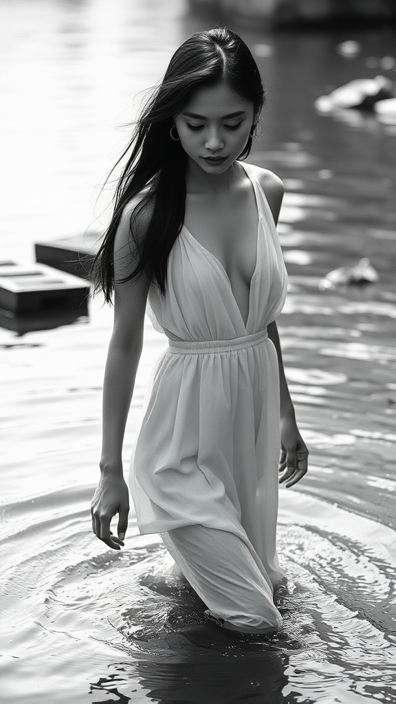 Capture a striking image of a charming young woman stepping out of the river, her delicate white dress clinging to her from the water, hair slick and shining in the daylight. The photograph should employ deep photographic techniques reminiscent of an Ilford HP5 film, showcasing a monochrome palette with rich crushed blacks and a defined depth of field. The composition should have an artistic, shadowy quality with noticeable film grain and embrace the nuances of natural light. Additionally, include a subtle watermark and signature in the design. Portray the subject with unique anatomical features, focusing on a distinct, thought-provoking style. She is of Chinese descent, and the scene retains a creative, slightly abstract edge while maintaining an overall sense of elegance.