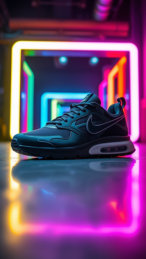 Capture a striking image of Nike sneakers with a sleek black and camouflage design, set against a backdrop where neon lights cast a vivid, spectacular reflection, creating a sense of vibrant productivity.
