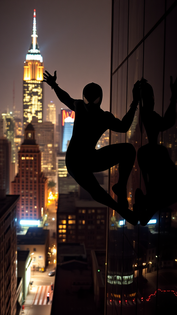 Capture a striking image of Spiderman in his sleek black suit, dramatically silhouetted against the vibrant metropolis at night. Effortlessly clinging to a towering skyscraper with one powerful hand, the bright city lights cast a luminous glow over the urban landscape, creating contrasting dark shadows and mysterious alleys below. Utilize a Canon EOS R5 equipped with a Canon RF 24-70mm f/2.8L lens, set the ISO to 200, and use an aperture of f/2.8. Adjust the shutter speed to 15 seconds for maximum exposure, with auto white balance to ensure optimal color tones. Steady your composition using a Manfrotto MT055CXPRO4 tripod, and capture the image with precision using a Canon BR-E1 remote shutter release. Experiment with low-angle shots and alternative framing to accentuate Spiderman's silhouette against the dazzling cityscape, incorporating dynamic elements that enhance the core concept's intensity and drama.