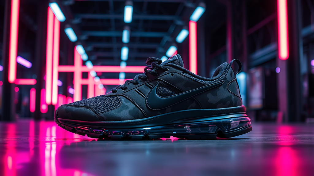 Capture a striking photograph of black Nike shoes featuring a bold camouflage pattern, set against a backdrop of spectacular neon lights that cast vibrant reflections, creating a dynamic and productive atmosphere.