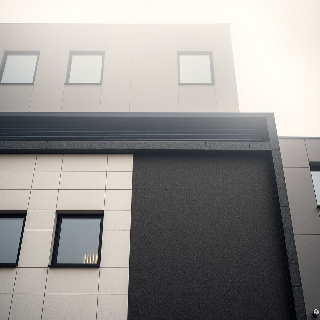 Capture a striking photograph using a Canon EOS 5D Mark IV with a 24mm f/1.4L II USM lens, with the aperture set at f/2.8 to achieve a depth of field that accentuates architectural photography. The image should present a minimalist building facade, innovatively blending various materials to create a visually appealing design. Strive for a clean composition with sharp lines, showcasing a balanced interplay between light and shadow characteristic of the ArchDaily style, emphasizing high contrast. Emulate a professional architectural photographer's approach by focusing on the facade's details and textures, including unique material patterns and the light's play through windows, creating a sense of depth and realism. With the facade as the primary focal point, capture dramatic lighting and a foggy ambiance, alongside realistic sunlight, to highlight the facade's design and materials, maintaining photographic realism and avoiding unrealistic scale while employing an aspect ratio of 9:16, incorporating raw style elements and a stylized degree of 750.