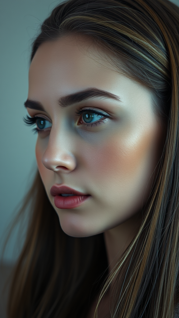 Capture a striking portrait of a serene woman gazing to the left, highlighting her vividly bright eyes that shimmer against a soft, understated background. Her complexion is impeccably smooth, enhancing the sharp detail of her facial features. This award-winning image employs an 85mm lens with an ISO setting of 400 to achieve precise focus, emphasizing her eye color and distinct characteristics. The shot uses a shutter speed of 1/500 and an aperture of f/1.8, creating a stunning contrast where her eyes and hair are brought into clear relief, surrounded by a beautifully blurred backdrop. With slight artistic enhancements, aim for a lifelike and high-resolution photograph that captures the essence of her expression and features.