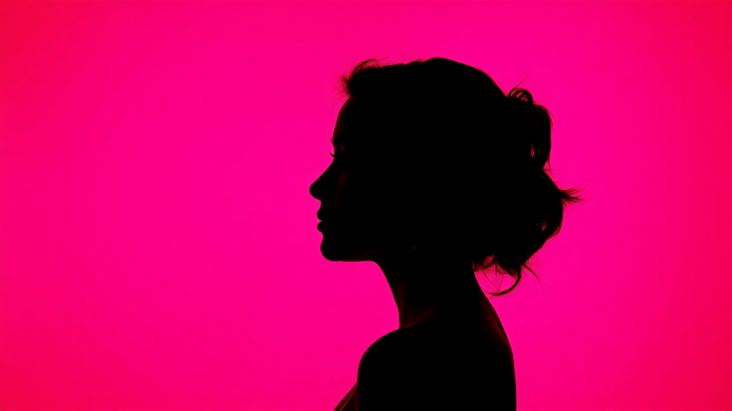 Capture a striking portrait of contrast featuring the profile silhouette of a woman against a vivid hot pink background, employing a camera setup that simulates a large aperture to sharply focus on the silhouette's edge. Maintain the richness of color without any grain using a low ISO, achieving a photorealistic effect in UHD quality. Enhance the scene with subtle creative elements such as intricate details in the silhouette's hair or slight variations in the backdrop hue to add depth, all while preserving the core essence of the original vision.