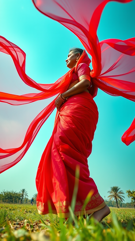 Capture a stunning full-body image from a bug's-eye perspective of an elegant 45-year-old Indian woman adorned in a flowing crimson Saree. Her attire cascades around her, creating vibrant waves in every direction, contributing to a breathtaking, dynamic scene. The photograph is taken from a low vantage point, focusing on a side view, with the camera angled steeply upwards, emphasizing her grace and poise from the ground up. Her head remains in the frame, enhancing the dramatic and visually powerful composition as the rich fabric dances in the air.