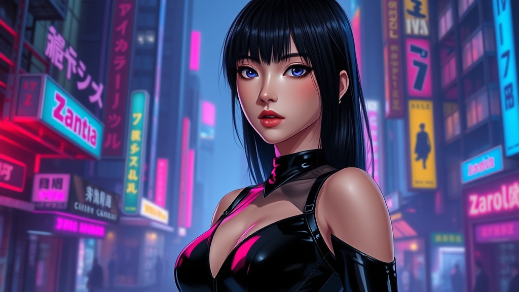 Capture a stunning full-body image of Reika in a sleek black latex bodysuit against a futuristic, cyberpunk cityscape reminiscent of Cyberpunk 2077. Her straight black hair flows elegantly, complementing her ultra-realistic, beautifully detailed face featuring jewel-like eyes. The scene is illuminated by vibrant neon lights, creating a chiaroscuro effect that highlights Reika's breathtaking features. The key visual is rich with intricate, vivid details, combining anime and cinematic styles. The overall composition should feel like a masterful, high-resolution CG wallpaper, showcasing an exquisite blend of science fiction elements and a dynamic urban backdrop.