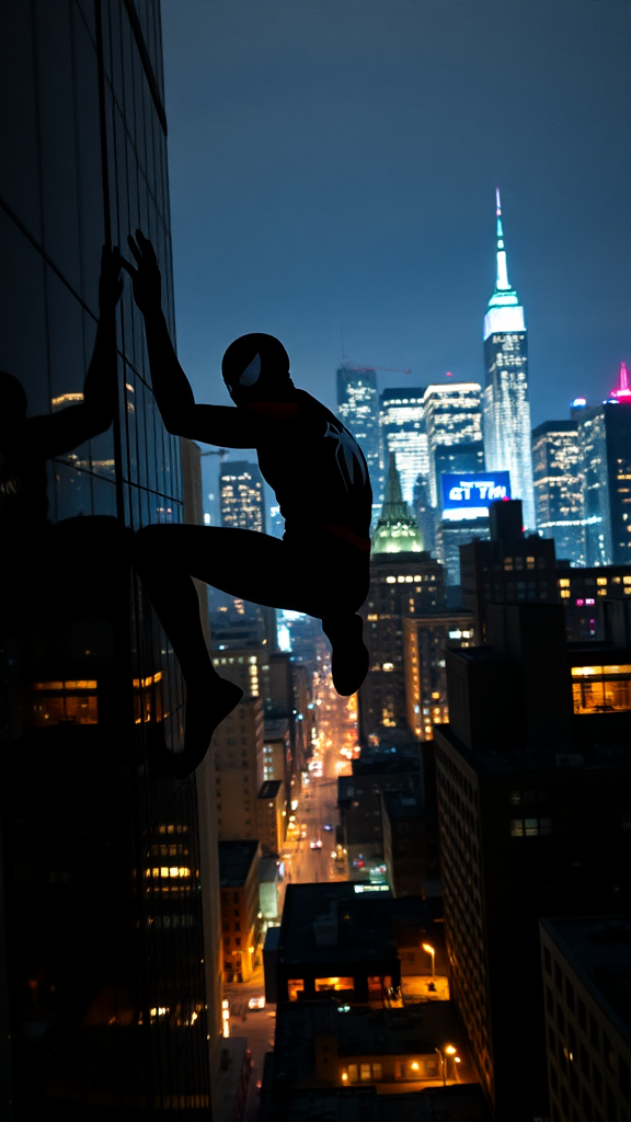 Capture a stunning, high-detailed, and super-realistic image of Spiderman in his sleek black suit, dramatically silhouetted against the night-time cityscape. He's effortlessly clinging to a towering building with one powerful hand. The skyline alive with bright lights and towering skyscrapers casts a luminous glow over the urban landscape, with dark shadows and alleys stretching below. Utilize a Canon EOS R5 with a Canon RF 24-70mm f/2.8L lens, setting the ISO to 200, the aperture at f/2.8, and a shutter speed of 15 seconds, with white balance on auto. Secure the shot using a Manfrotto MT055CXPRO4 tripod and a Canon BR-E1 remote shutter release, experimenting with low-angle shots and unique framing to emphasize Spiderman's striking silhouette against the vibrant city lights. Adjust composition subtly to enhance dramatic effect while maintaining the core essence of the scene.
