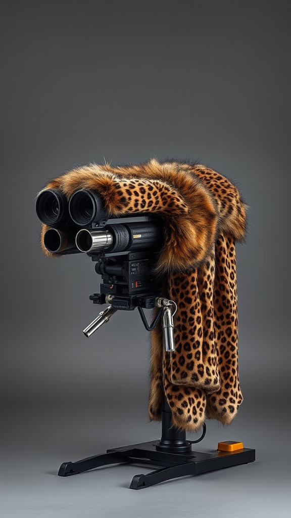 Capture a stunning image of an art piece featuring an antitank rocket launcher adorned with luxurious leopard fur. The artwork, a BGM-71 TOW missile launcher, is intentionally provocative, integrating the hardness of military equipment with the softness of animal skin. Photographed in a professional studio against a neutral grey backdrop, the composition emphasizes the striking contrast and duality of the materials. The setup employs professional studio lighting with softbox illumination, creating a captivating bokeh effect. The camera is positioned at a 45-degree angle for a close-up shot, utilizing a 35mm lens, ISO 100, with a low shutter speed and an aperture of f4. This is a high-quality digital photograph, symbolizing professional product photography.