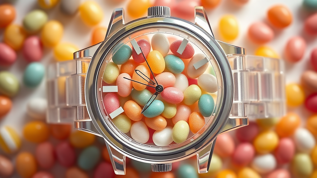 Capture a top-down cinematic fine art photo shoot in a professional studio setting, spotlighting a transparent vinyl watch crafted from translucent glass. The watch is intricately filled with an array of colorful mini jelly beans, creating a striking visual. With a high refractive index, the watch features frosted glass elements, presented in soft pastel hues with a subtle pale yellow accent as a highlight. This composition draws inspiration from the Dieter Rams aesthetic, merging functionality with minimalist design elegance.