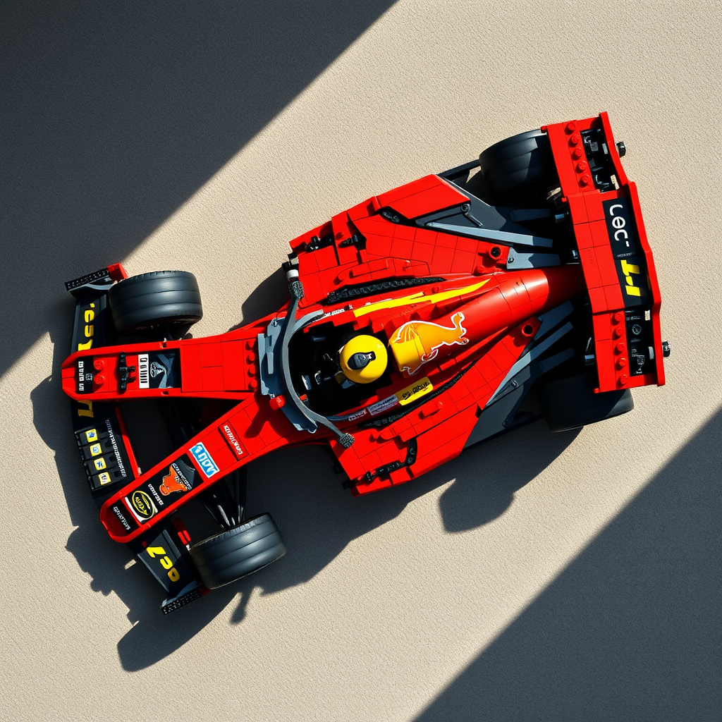 Capture a top view photograph of an intricately detailed, life-sized Lego art creation of an F1 car, showcasing the complexity and precision of each brick element. Ensure the composition is flawlessly balanced, highlighting the stunning craftsmanship. Natural lighting with subtle, soft shadows enhances the photorealism, bringing out the rich textures and vibrant colors of the Lego pieces.