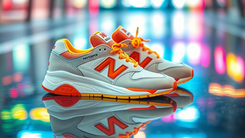 Capture a vibrant scene featuring a pair of New Balance 327 sneakers in white and orange, complemented by hints of yellow, set against a shiny surface that showcases a reflective play of colors, evoking a sense of dynamic productivity.