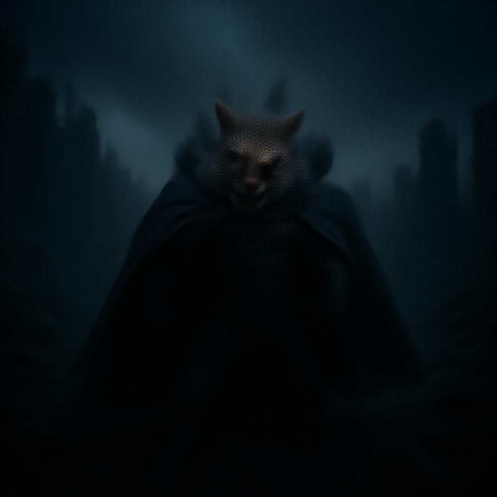 Capture an 8k uhd image of a squirrel striking a heroic pose as batman, adorned in a sleek black costume, set against the backdrop of a city in ruins under a menacing stormy sky. The scene should convey a dramatic yet whimsical atmosphere, with the soft lighting enhancing the texture and detail, as if shot on a high-quality DSLR camera like the Fujifilm XT3. Subtle film grain should be present, adding a cinematic touch to the overall high-quality image.