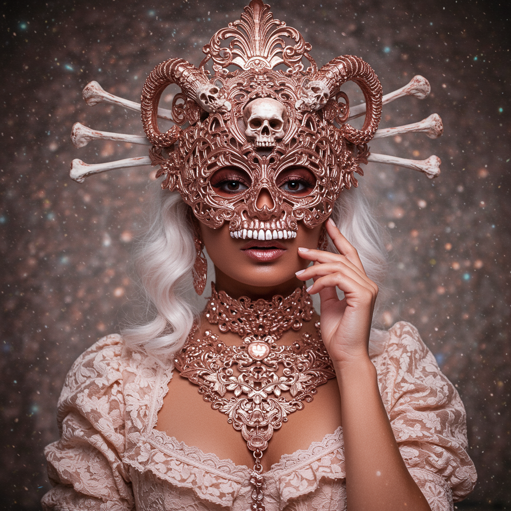 Capture an ethereal photo portrait of a woman adorned with an intricate skull and bone mask, featuring a palette of rose gold and white hues. The composition draws inspiration from vogue-style photography, with the woman gazing directly into the camera. Her tan skin adds warmth to the scene, amidst a backdrop of dreamy, celestialpunk ambiance. The attire reflects baroque-inspired elegance, characterized by ornate details. Shot with a Canon 50mm 1.2L lens, the image is rendered with ultra details, embracing a fashion editorial aesthetic. The overall tone embodies a raw, stylized vision while maintaining a balance between fantasy and sophistication.