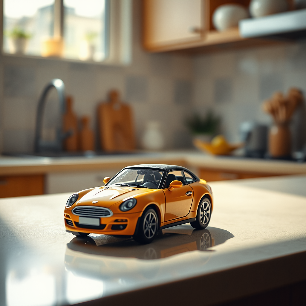 Capture an exquisitely detailed photograph of a miniature toy car placed on the kitchen countertop, showcasing professional color grading with a gentle interplay of soft shadows and low contrast. The scene is presented in pristine sharp focus, achieved through advanced 8k rendering, revealing intricate details reminiscent of high-resolution film photography. The kitchen is bathed in bright natural light, creating a clean and vibrant atmosphere that highlights the car's features. This immersive stock photo merges realism with creative flair, emphasizing the artistry in everyday life within a bright, HDR setting, maintaining a 3:2 aspect ratio.