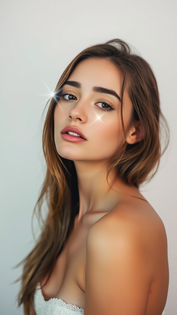 Capture an image of a female model against a white backdrop, with light flares artistically illuminating her face, giving an ethereal and almost invisible quality. The composition should maintain a raw and unfiltered appearance, embracing a natural yet surreal aesthetic.